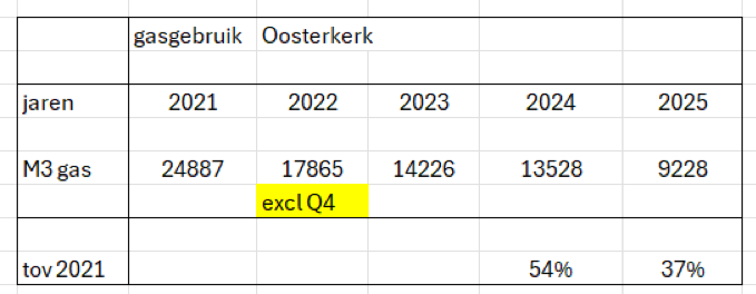 Het gasverbruik in de kerk was in 2023 per graaddag 42 m3 en in 2024 3,32 m3. En dat is dus 21% minder. Oktober is natuurlijk nog niet representatief; pas na december kunnen we conclusies trekken over het effect van de isolatie.