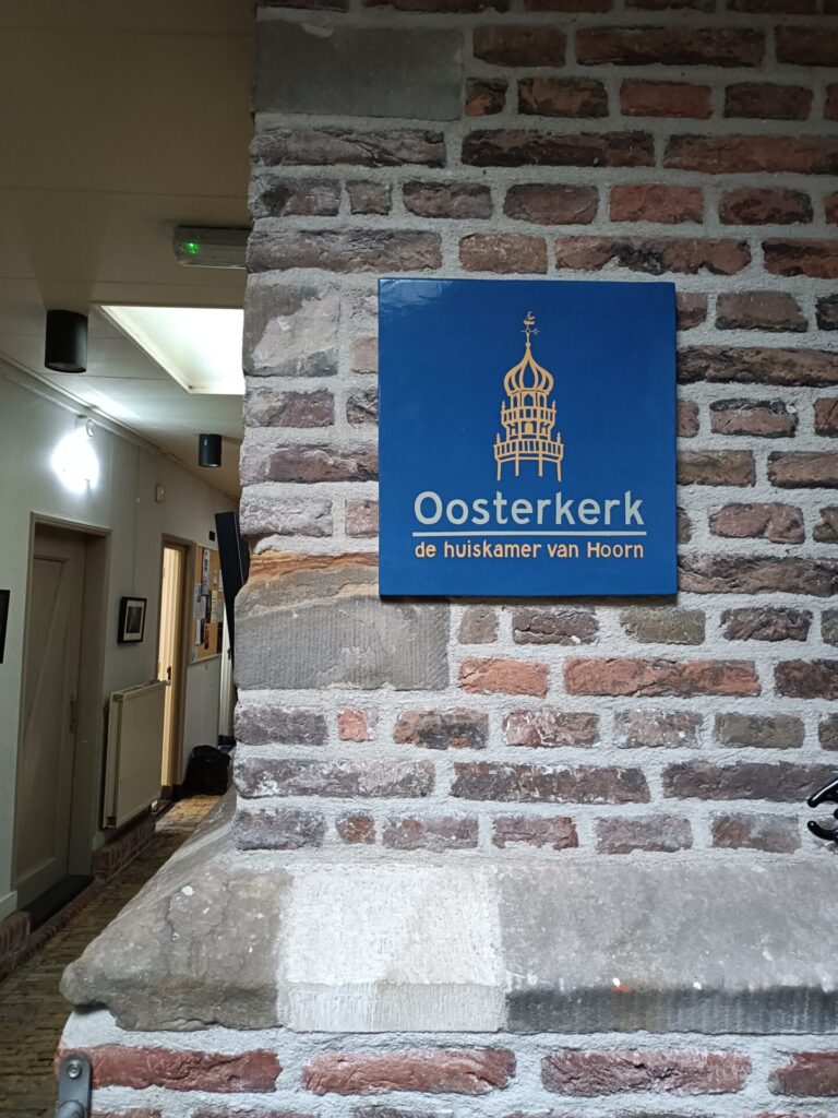 En wel zo dat het voor de bezoeker onmiddellijk is dat men De Huiskamer van Hoorn binnentreedt. Achterop het bord heeft Leo zijn naam aangebracht en natuurlijk de naam van de ontwerpster: Sefanja Nods. Een verrijking voor de Oosterkerk!