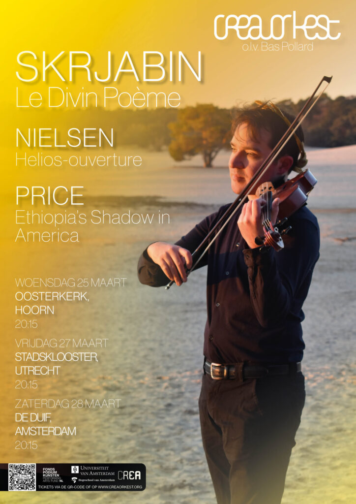 Dit programma staat de goddelijkheid centraal, met als hoofdwerk de derde symfonie van Alexandr Skrjabin “Les divin Poéme”. Hij schreef dit mystieke en kleurrijke werk in 1902. Skrjabin leed aan synesthesie, wat betekende dat hij kleuren kon horen en klanken kon zien. Daarnaast worden twee kortere werken gespeeld, Carl Nielsens zonovergoten Helios-ouverture ☀️ en Florence Price’ indrukwekkende Ethiopia’s Shadow in America.