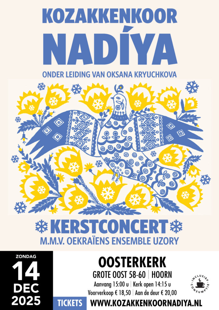 Het Kozakkenkoor Nadiya onder leiding van de van oorsprong Oekraïense dirigent Oksana Kryuchkova, geeft een prachtig Kerstconcert in de Oosterkerk te Hoorn.