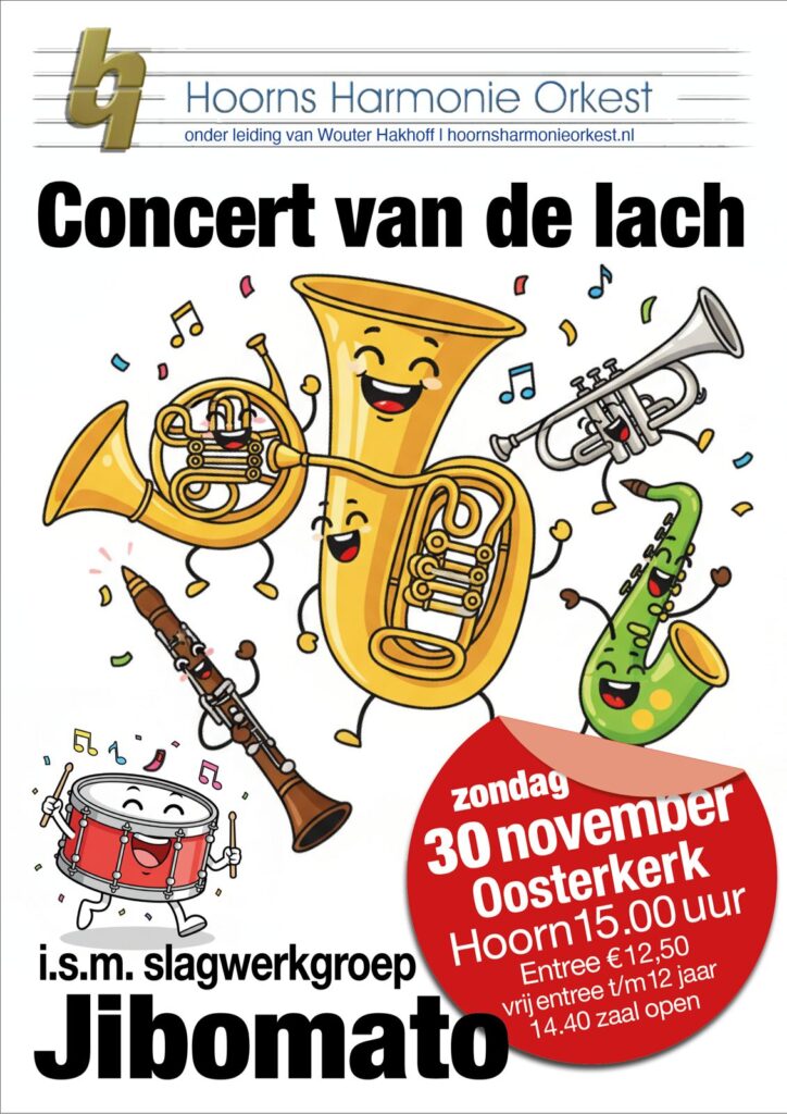 Laat je verrassen door een unieke mix van muziek en humor tijdens het Concert van de Lach! Het Hoorns Harmonie Orkest slaat de handen ineen met de energieke slagwerkgroep Jibomato voor een avond vol vrolijke noten, komische verrassingen en muzikaal spektakel.